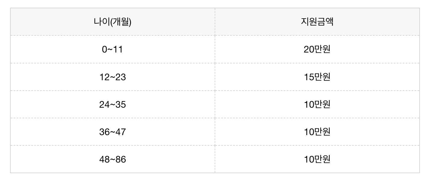 양육수당은 아동의 연령에 따라 지급금액이 달라집니다. 매달 정해진 금액을 지원받을 수 있으며, 구체적인 지원액은 아래와 같습니다.