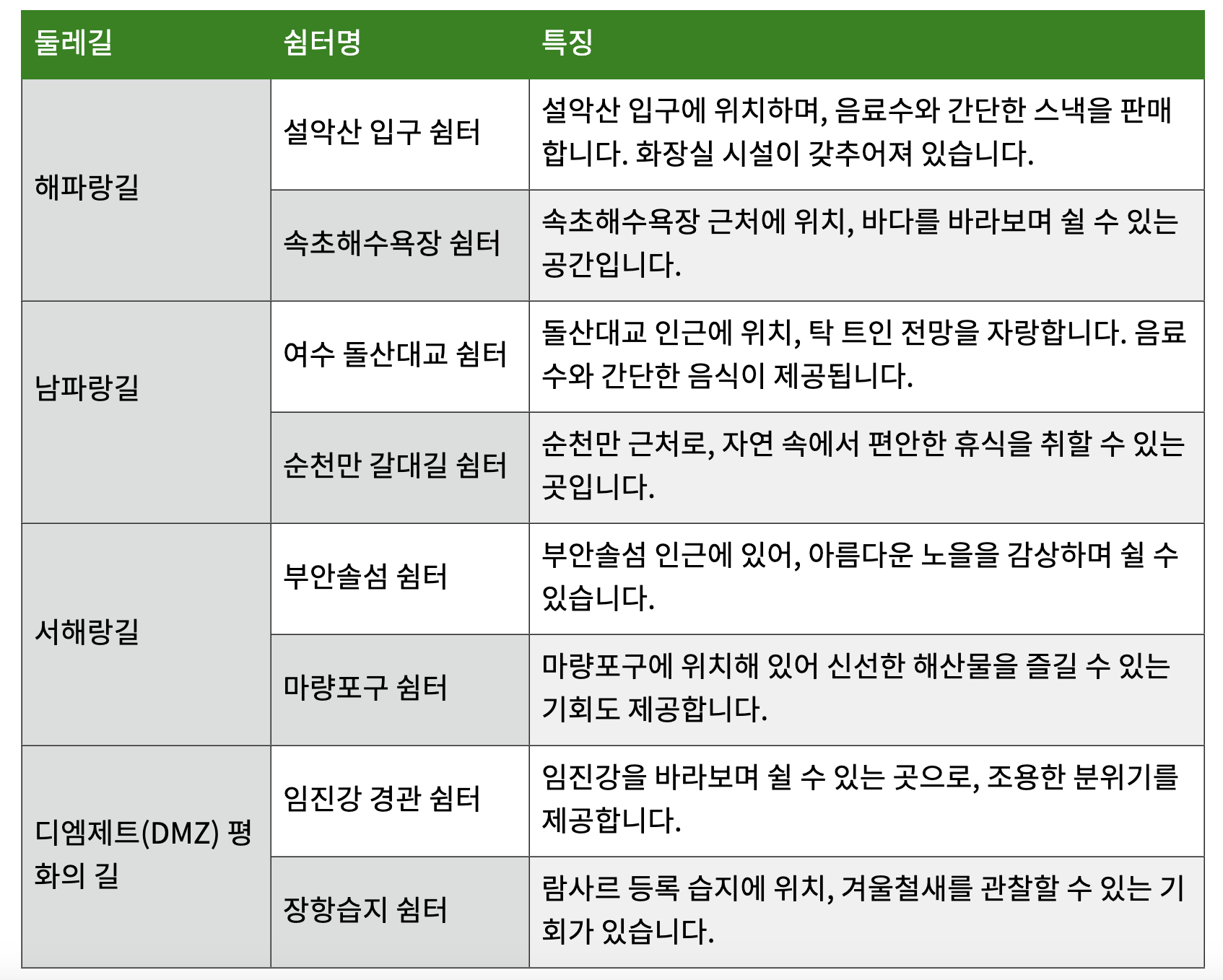 코리아둘레길에는 각 구간별로 편안하게 쉴 수 있는 쉼터가 마련되어 있습니다.